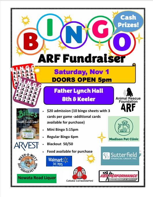 Saturday, Nov 1! Join us for a night of prizes, laughs, and BINGO magic—all to support a great cause! We're rolling out the fun with thrilling bingo rounds, pawsome surprises, and delightful treats—all set in a fresh new venue with a heartwarming mission behind it.