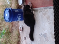 Barely 6 months old, friendly with a magenta nose and yellow eyes. She was wearing a blue and pink collar